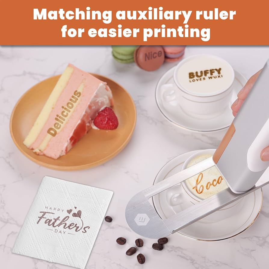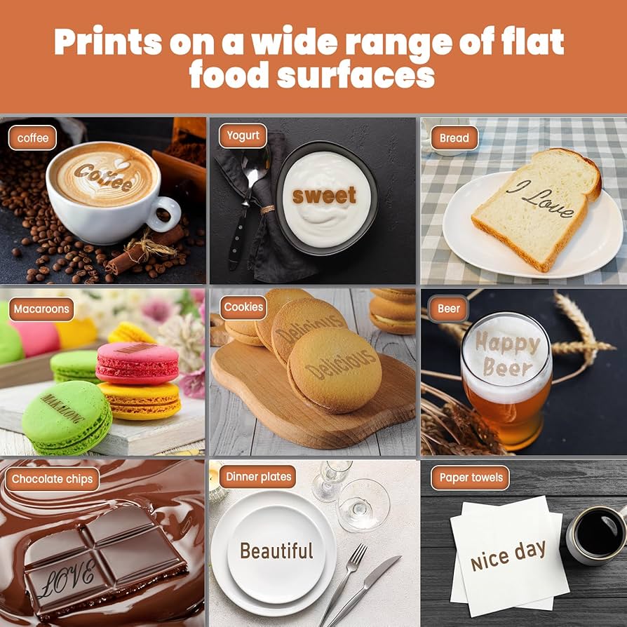Transform everyday treats into personalized masterpieces with the Portable Food Print Pen. Designed for creative professionals and home enthusiasts alike, this compact and innovative device allows you to print custom images, text, logos, dates, QR codes, and barcodes directly onto foamed drinks like lattes and cappuccinos as well as edible items such as cookies and macarons