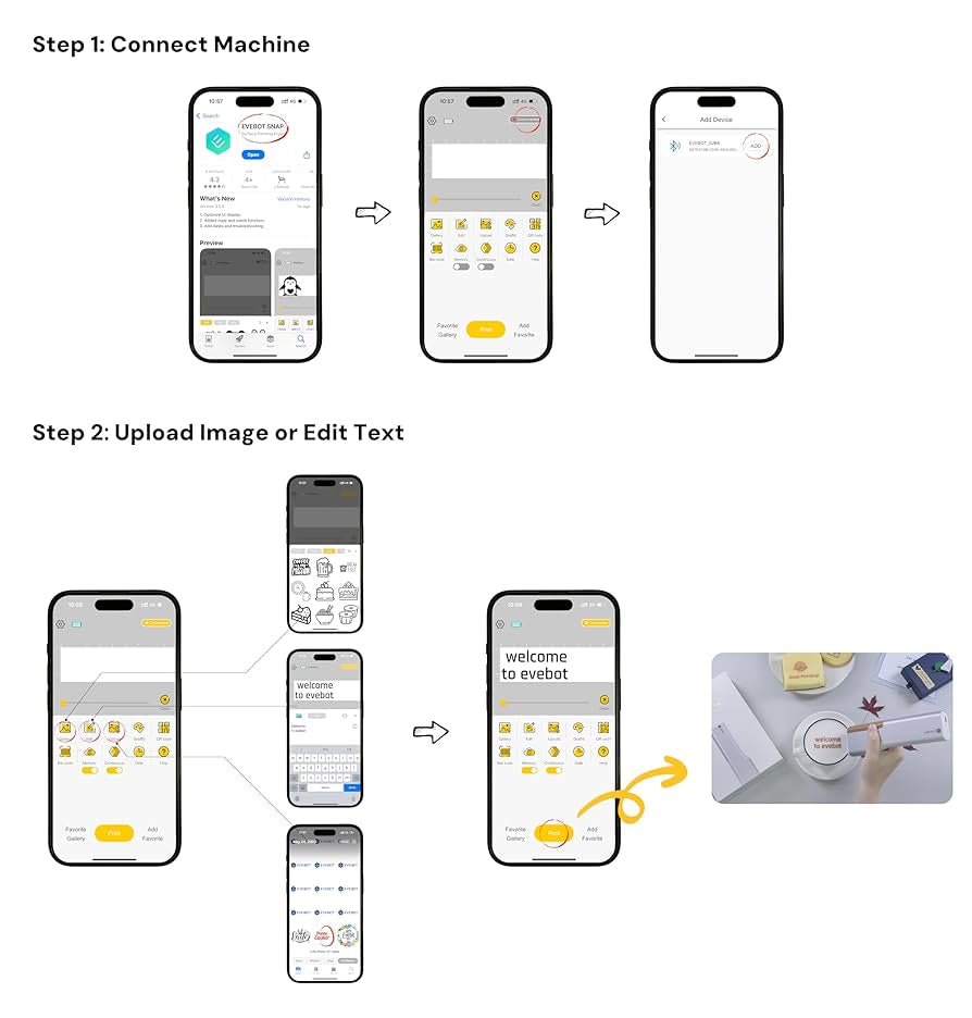 Using advanced roller sensor technology the PrintPen effortlessly prints on both flat and curved surfaces. Thanks to its built-in memory function you can power off and restart without losing your latest design. Pair it with the EVEBOT SNAP app via Bluetooth 4.2 for seamless operation and design uploads