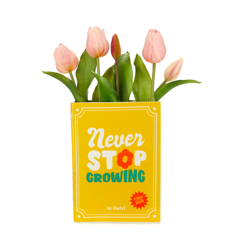 • ORIGINAL DESIGN. Its book shape, attractive yellow color, and personal growth message “Never stop growing” make this vase a perfect decorative piece for any room.