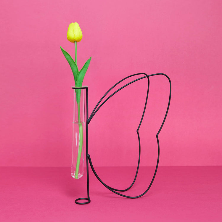 Vase Metal Black Butterfly a Silhouette in metal with test tube vase Metal/glass 27x10x22 cm. DECORATIVE - Show off your flowers elegantly in any space: bedroom, living room, kitchen, desk, office... ORIGINAL DESIGN - The glass vase is the vaseand the metal stand serves as a holder. The finish is beautiful and striking. PERFECT GIFT - Gift idea for decoration and plant lovers. FUNCTIONAL - Any type of flower can be placed in the vase. Easy to clean....